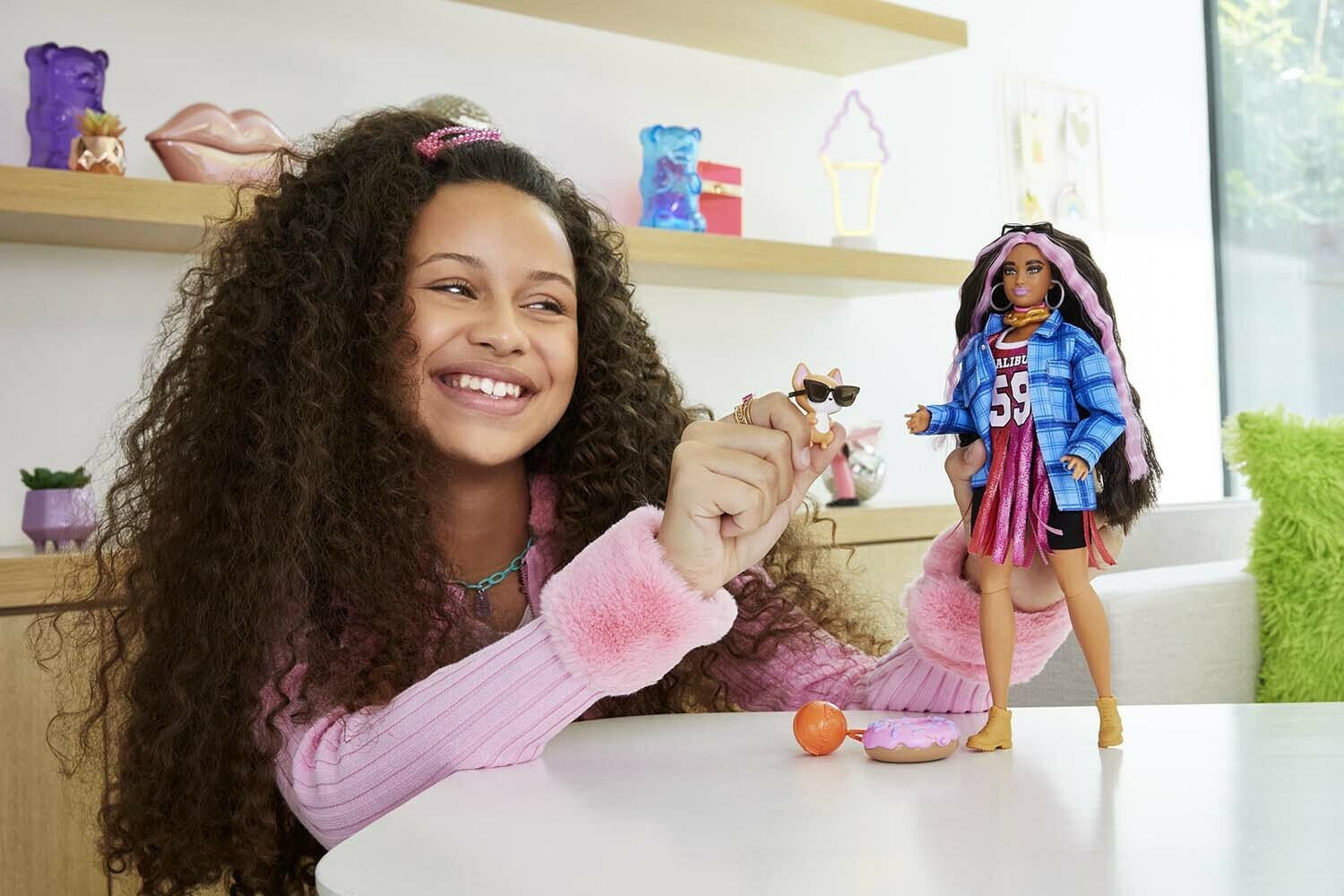 Τα μαλλιά της Barbie είναι πολύ μακριά με έντονες ροζ ανταύγιες. Αναδεικνύει την αυτοπεποίθησή της φορώντας φαρδύ πουκάμισο, αστραφτερό αθλητικό φόρεμα με κρόσια και μαύρο σορτσάκι. Τα αξεσουάρ της περιλαμβάνουν μια τσάντα-μπάλα, γυαλιά ηλίου με φλόγες, χρυσαφί κολιέ και μοντέρνα μποτάκια, που βοηθούν τα παιδιά να εκφραστούν και να δημιουργήσουν τις δικές τους ιστορίες. Το σκυλάκι της είναι κι αυτό εξίσου μοντέρνο, με γυαλιά ηλίου, σωσίβιο-ντόνατ και χαριτωμένη έκφραση.