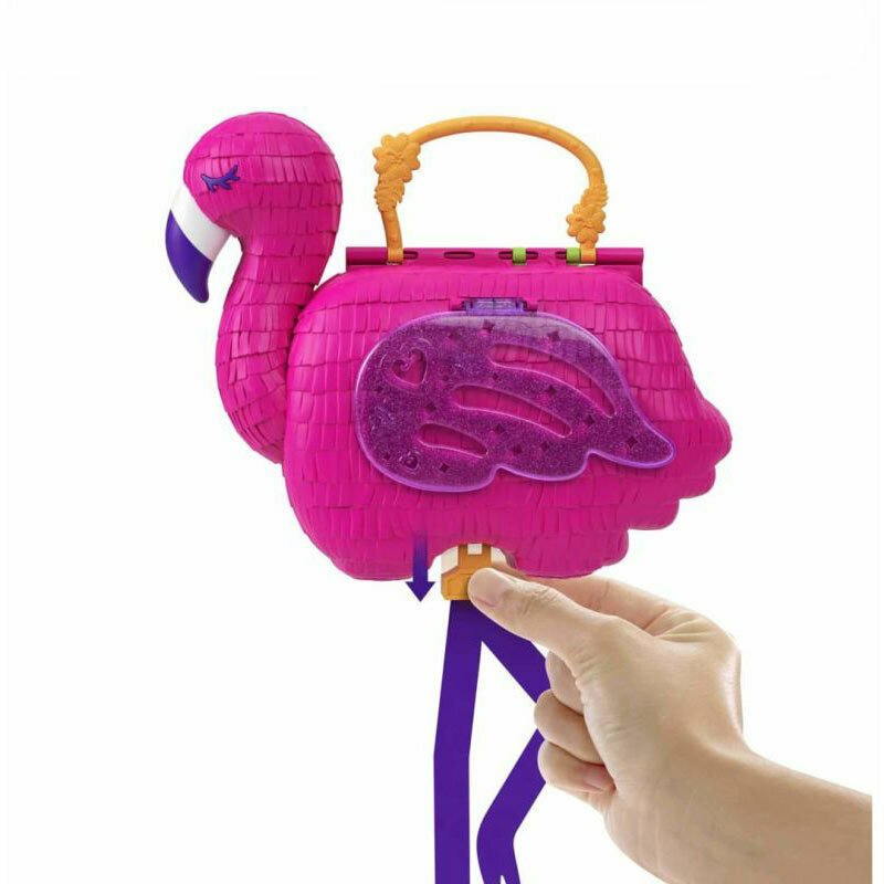 Σετ παιχνιδιού Flamingo Party από την σειρά Polly Pocket της εταιρίας Mattel με πάνω από 26 εκπλήξεις.Μπορείτε να συνδέσετε την κούκλα στον κορμό του φοίνικα για να σκαρφαλώσει πάνω-κάτω ή τη μαϊμού στο δέντρο και την κούκλα στη μαϊμού και να κουνηθεί.Μία περιστρεφόμενη πίστα χορού αποκαλύπτεται όταν γυρίσει το μεγάλο φύλλο στην καλύβα.Βρες τον αποθηκευτικό χώρο στο σεντούκι του θησαυρού και πολλές άλλες εκπλήξεις!Κατάλληλο για 4+ ετών.