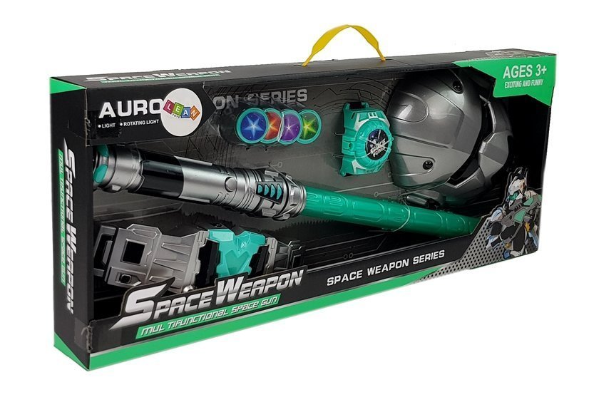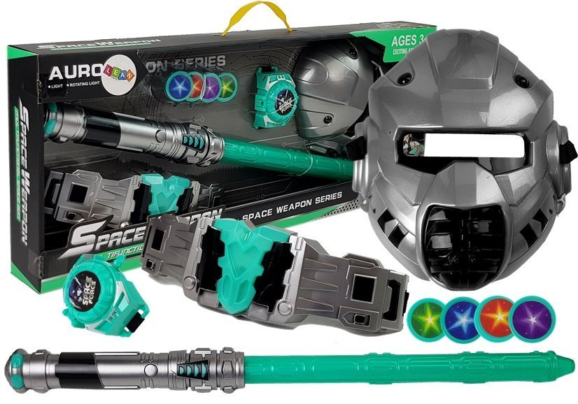 Το σπαθί κάνει ηχητικά εφέ και επίσης λάμπει μπλε. Η ζώνη του σετ φέρει λάστιχο στο πίσω μέρος, χάρη στην οποία η ζώνη δεν πέφτει αφού τη φορέσει και προσαρμόζεται εύκολα στο παιδί. Αφού πατήσετε το κουμπί από το πάνω μέρος της ζώνης, μπορείτε να ακούσετε min. ήχους λήψης και δείτε εφέ φωτισμού. Στο σκοτάδι, μαζί με τη ζώνη, καταπλήσσουν με το αποτέλεσμα. Επιπλέον, το σετ περιλαμβάνει μάσκα, αφού το νήπιο θα τη φορέσει θα μοιάζει με διαστημικό πολεμιστή. Όλο το σετ είναι σε μαύρο, ασημί και τιρκουάζ. Η παρεχόμενη στάμνα μπορεί να φορεθεί στο χέρι σας και να βάλετε τους δίσκους μέσα και να τους πυροβολήσετε στον εχθρό.