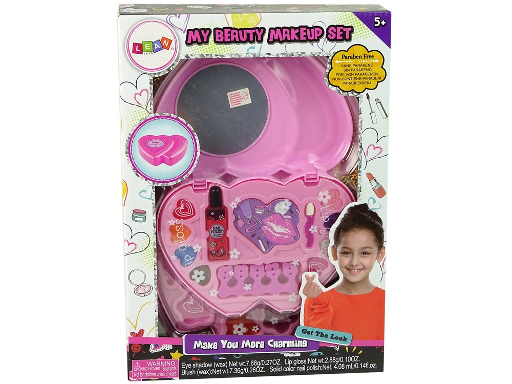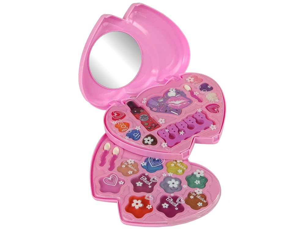 Το κοριτσάκι μπορεί να επιλέξει ανάμεσα σε πολλές σκιές ματιών, πώς θα ζωγραφίσει τον εαυτό της για τη μεγάλη βραδινή έξοδο σήμερα. Όλα έρχονται σε ένα όμορφο κουτί σε σχήμα ροζ καρδιάς. Αποτελείται από 2 παλέτες και έναν καθρέφτη, το ένα συρτάρι με γυαλάδες και βερνίκια νυχιών, το άλλο με σκιές και ρουζ. Στο καπάκι θα βρει έναν καθρέφτη στον οποίο η μικρή μπορεί να ζωγραφίσει με ακρίβεια τον εαυτό της και να ελέγξει την εμφάνιση του μακιγιάζ της.