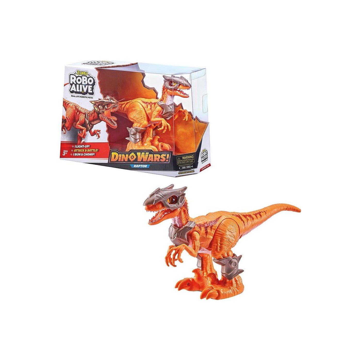 O Robo Alive Ραπτορας είναι πανέτοιμος για τη μάχη των δεινοσαύρων! Ο Ράπτορας Dino Wars με το απίστευτα ρεαλιστικό design, την πανοπλία και την προηγμένη ρομποτική τεχνολογία, ξεπερνάει όλους τους άλλους θηρευτές. Τα φωτιζόμενα χαρακτηριστικά του, του επιτρέπουν να τρέχει και να κυνηγάει στο σκοτάδι. Ας ξεκινήσουν τα Dino Wars!